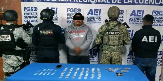 Oaxaca de Juárez, Oax., a 16 de enero de 2026.- Como parte de las acciones coordinadas para el combate a los delitos contra la salud, la Fiscalía General del Estado de Oaxaca (FGEO) detuvo en flagrancia a una persona del sexo masculino identificada como F.G.R., por el delito contra la salud, en su modalidad de narcomenudeo, en la hipótesis de comercio de clorhidrato de cocaína, metanfetamina y hierba seca con características propias de la marihuana, en hechos ocurridos en la región de la Cuenca del Papaloapan.